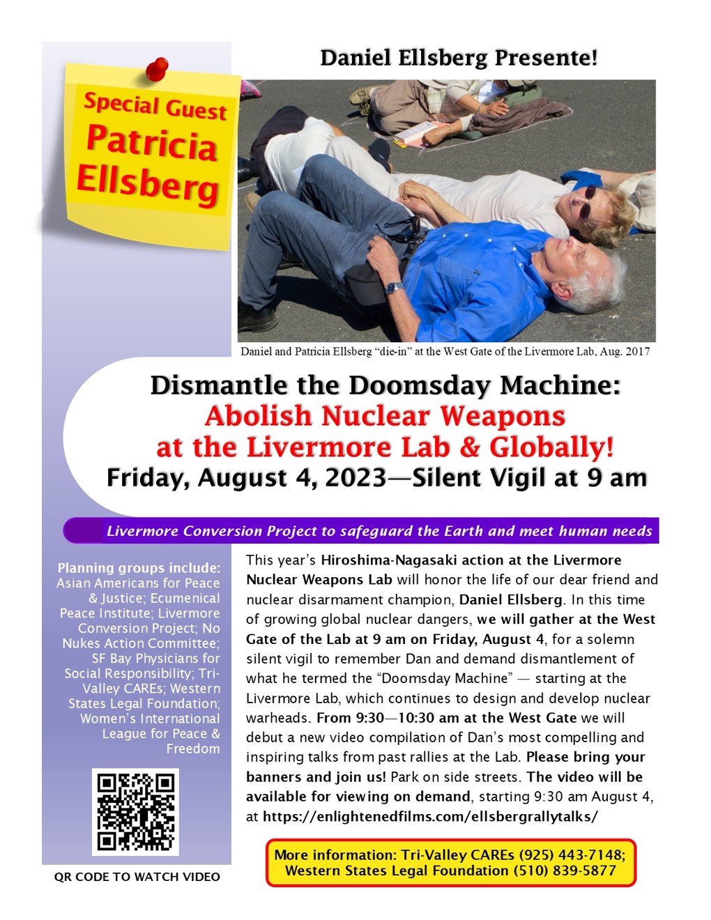 At 9:30 AM, a film featuring excerpts from six of Daniel Ellsberg’s many talks at the Livermore Lab August rallies over the years will debut. We will have a monitor and equipment on site so that we can watch it together as a community.